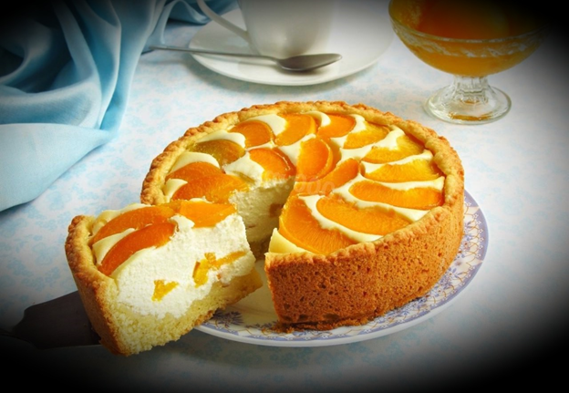 Ингредиенты: мука, яйца, разрыхлитель, творожная масса, сливки, сливочное масло, цедра лимона, сахар, крахмал, персики консервированные.
