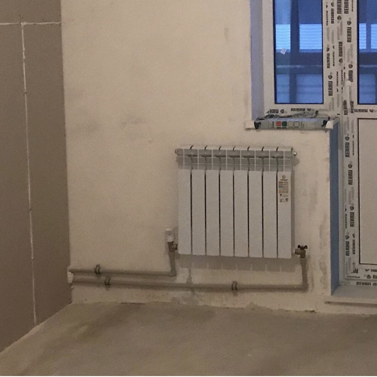 При покупке, в нашей квартире висел радиатор с подведёнными к нему трубами наружно... голые полы с неровностями, которые