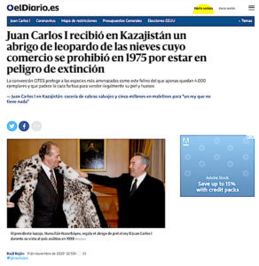 Courrier International цитирует El Diario, сообщая, что в 1998 году, во время «частного визита в Казахстан», испанский король, который в то время был главой государства, «получил из рук Назарбаева белую шубу с черными пятнами – пишет Радио Азаттык. [Этот] мех, очевидно, представлял собой шкуры снежного барса, торговля которыми запрещена с 1975 года.