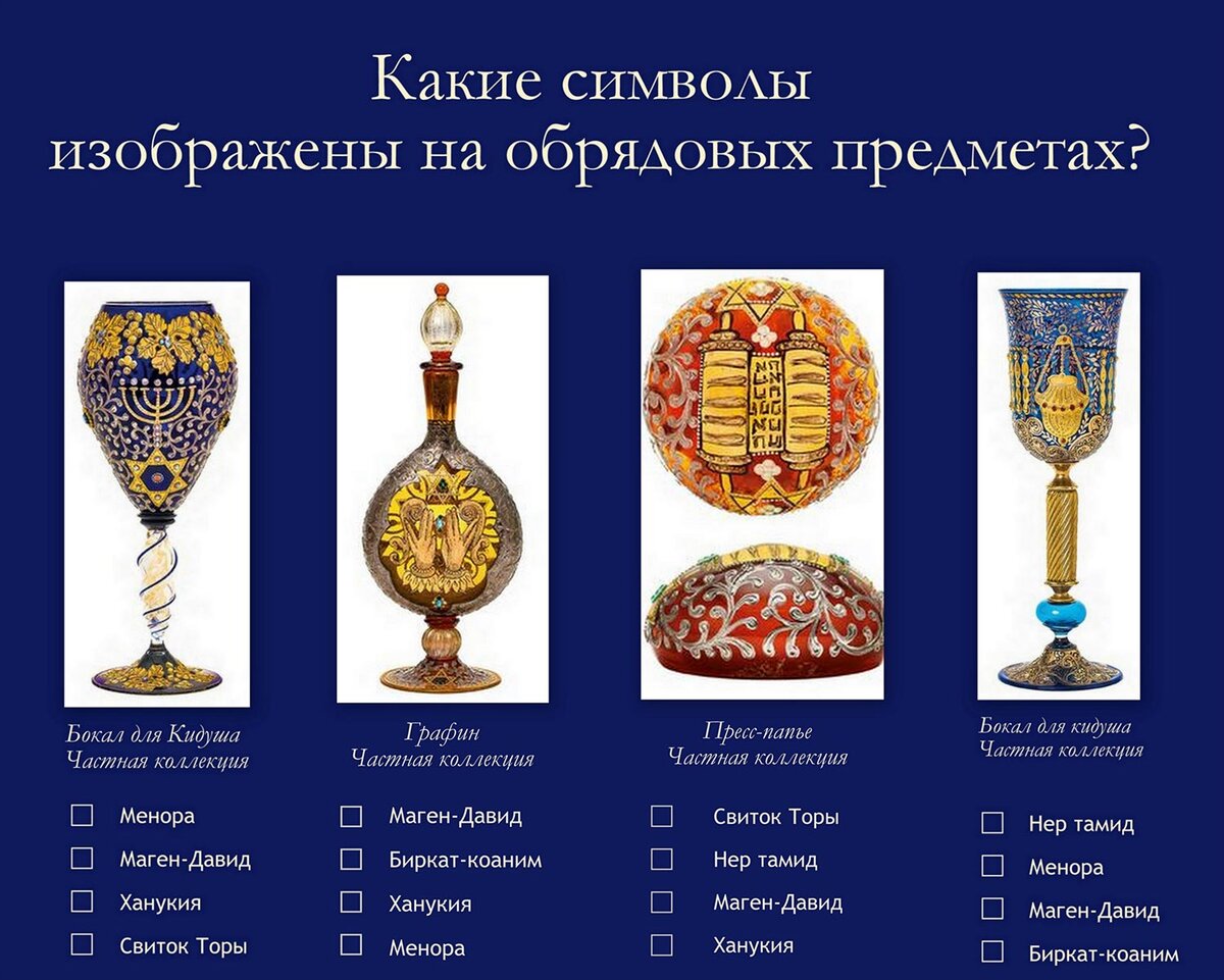 В собрании представлены разнообразные по своим формам чаши и бокалы, кувшины и графины, парные подсвечники, блюда и подносы, скульптурные украшения и пресс-папье - посуда и предметы быта, предназначенные для «пользования» и украшения стола в дни праздников и постов, как, например, в Песах, Шавуот, Суккот, Пурим и, конечно же, в Шаббат.