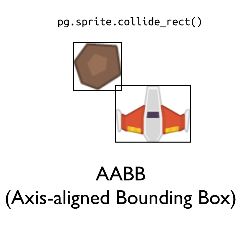 Тип столкновения по умолчанию в Pygame — функция collide_rect(), которая высчитывает атрибуты rect спрайтов, чтобы понять, пересекаются ли они. Это столкновения AABB, которые работают быстро и надежно. Однако если изображения спрайтов не являются прямоугольниками, то происходит ситуация как на изображении выше. Прямоугольники пересекаются, функция collide_rect возвращает True, но игрок разочарован, потому что он-то на самом деле избежал столкновения.