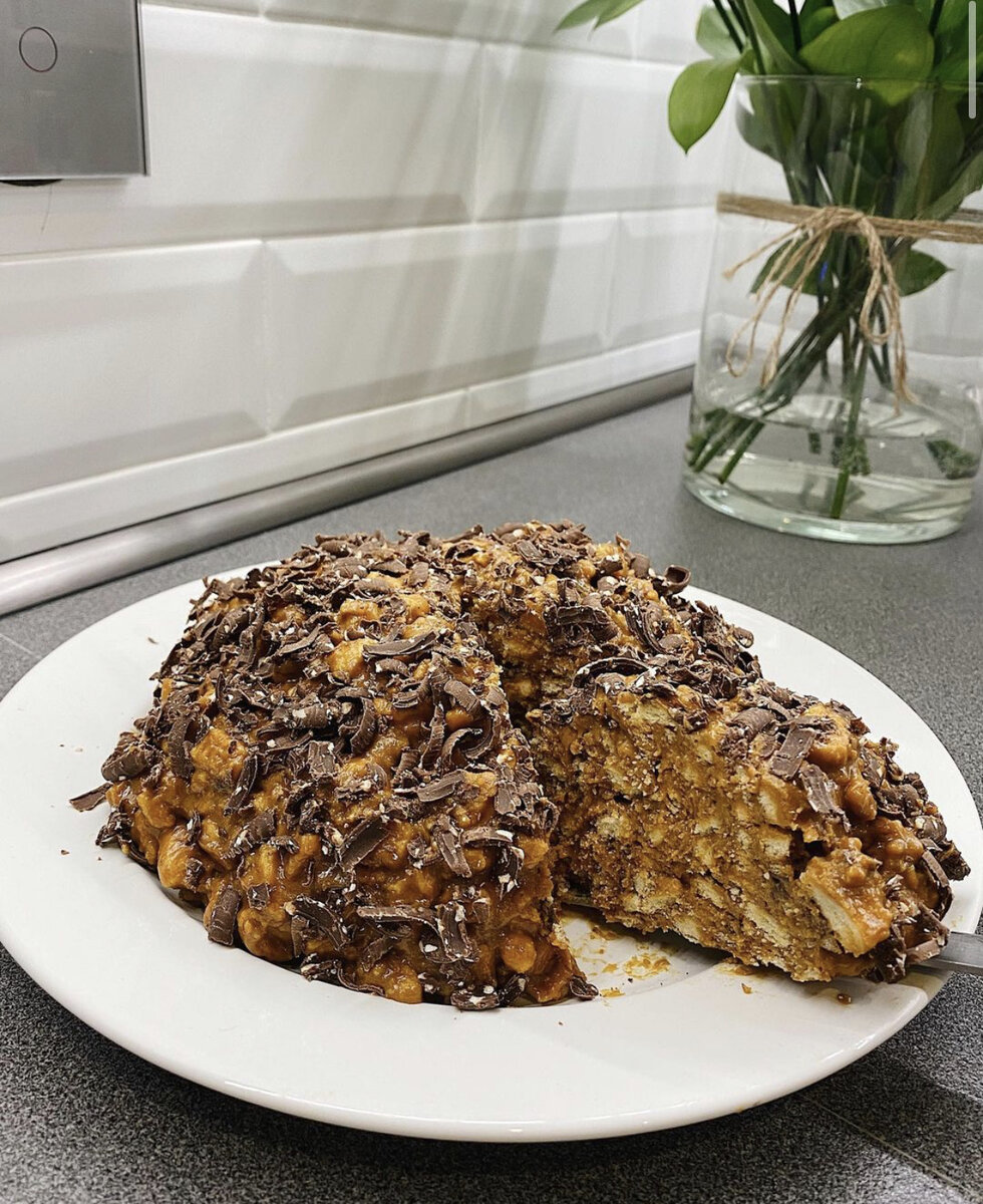 В отдельной чаше смешиваем масло, сметану и сгущенку, трём туда 1/2 плитки шоколада. Затем эту смесь мы добавляем в чашу с измельченным печеньем, все хорошенько перемешиваем. Далее полученную массу выкладываем на тарелку горкой, сверху украшаем тертым шоколадом и на ночь убираем в холодильник. Приятного аппетита!