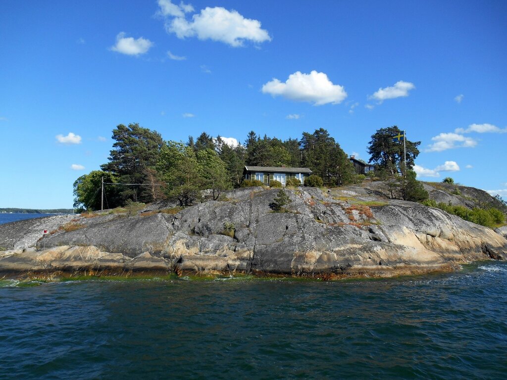 Островки, действительно, все каменистые, но настолько заросли соснами, что смотрятся, как картинки, очень живописно. Тем более во многих местах стоят у самого берега или просматриваются сквозь листву уютные домики, маленькие чистенькие виллы, похожие скорее на добротные частные дома, чем на летние дачи. Почти возле каждого домика мосточки, что ведут к воде, и у берега колышется яхточка. Тем не менее, экскурсовод утверждал, что это все дачи людей среднего класса.