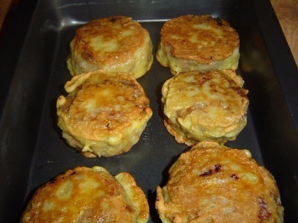 Для кляра взбиваем яйцо, добавляем 1/3 стакана молока, муку, соль, хорошо перемешиваем. Зразы обмакиваем в кляр и выкладываем на разогретую и смазанную маслом сковородку. Обжариваем без крышки на среднем огне до золотистого цвета. Доводим до готовности в духовке. Примерно 15 минут при температуре 200 градусов.