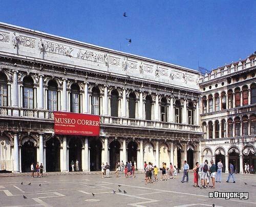 Нынешнее здание Музея Коррер было построено в самом начале 19-го века на месте старинной церкви Сан Джеминиано, которая в середине 16-го века была перестроена по проекту Якопо Сансовино и стояла между Прокуратие Веккие и Прокуратие Нуове – двух длинных арочных зданий, тянувшихся вдоль всей Пьяцца Сан Марко. В этих зданиях размещались офисы и резиденции влиятельнейших политических деятелей Венецианской Республики. Новый дворец строился как резиденция Наполеона, но был завершен уже в годы австрийского господства и служил резиденций двора Габсбургов в Венеции. Архитекторами этого здания с монументальным двойным фасадом, каким-то мистическим портиком, просторной лестницей и роскошным бальным залом были Джованни Антонио Антолини, Джузеппе Соли и Лоренцо Санти. Над декорациями дворца работал венецианский художник Джузеппе Борсато, который тщательно воспроизвел в интерьере императорский стиль, а потолок над парадной лестницей в 1837-38-м годах был расписан фресками Себастьяно Санти.