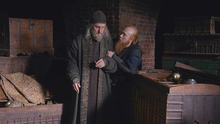 Действительно аскетичный наряд можно увидеть на Сергее Маковецком, когда Иван Грозный перестраивает жизнь опричников по монашескому уставу. На царе – власяница, одеяние из груботканого полотна с верблюжьим волосом для усмирения плоти. Шапочка-тафья напоминает монашескую скуфейку, но сшита из дорогой ткани. И прежде чем Грозный Маковецкого облачится в этот темный наряд, зритель увидит его и в узорных шелках, и в царских драгоценных мехах.