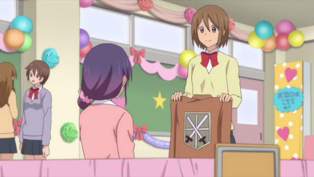 Отсылочка получилась достаточно затянутой, ибо это был косплей героини (и даже героя) на фестивале. И видимо им этого не хватило, поэтому нарисовали главгероиню в виде поедательницы картошки из Атаки (забыл как её зовут, простите) на фоне известной нами стены.