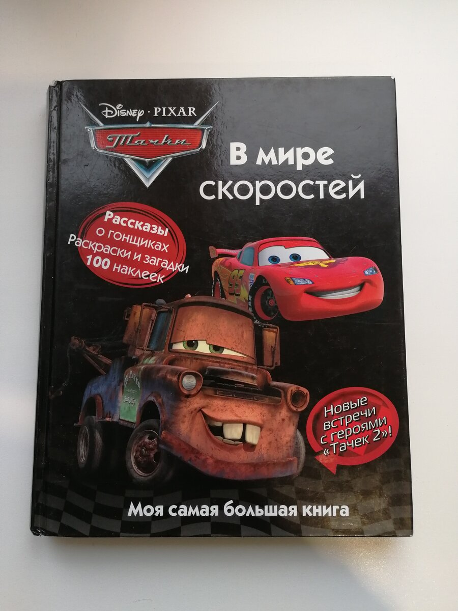 Итак, весной 2017 года в нашей библиотеке появилась толстенькая, увесистая книга формата 60*90 из 217 страниц офсетной бумаги с плотной картонной обложкой, на которой красовались изображения героев полнометражного диснеевского мультфильма "Тачки". Мой сын, к тому времени ему было 2,5 года, был частично знаком с персонажами по игрушкам и изображениям на футболках, которые он носил. Но саму историю гонщика Молнии МакКуина и его друзей он до сих пор еще не видел (ему скоро 6 лет). Однако, интерес к книге и рассказам, изложенным там, что у старшего, что теперь у младшего - крайне велик.