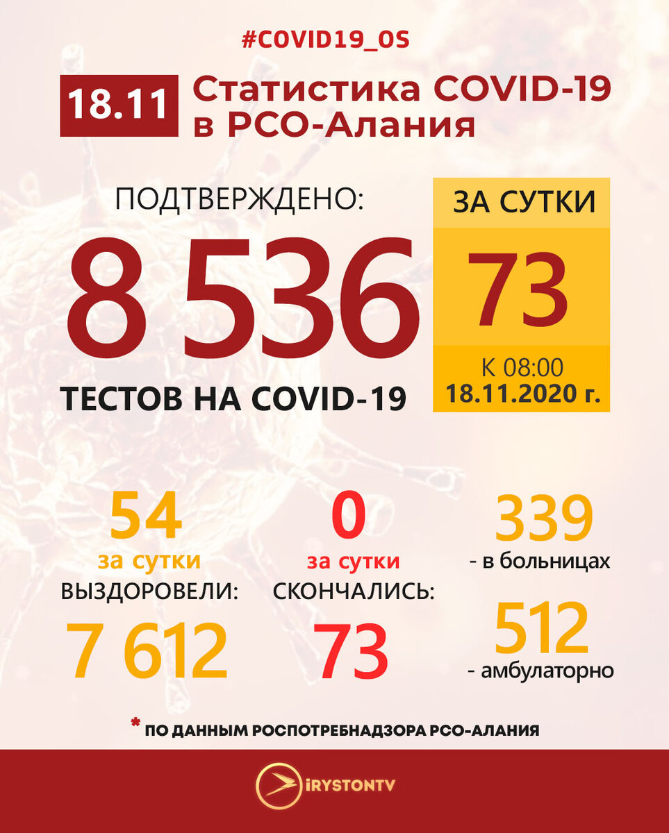 По данным Роспотребнадзора РСО-Алания на 08:00 18 ноября 2020 года в Республике Северная Осетия-Алания зарегистрировано 8 536 (+ 73 за сутки) случаев заражения новой коронавирусной инфекцией.