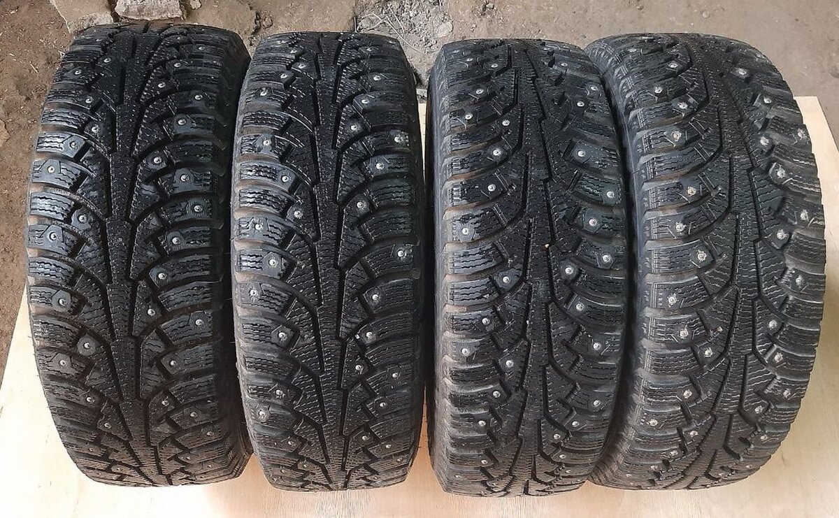 Я нашел комплект на новых штампованных дисках R14 с побегом в один сезон. То есть резина практически новая, протектор чуть больше 8 мм. шипы все на месте и не стертые.