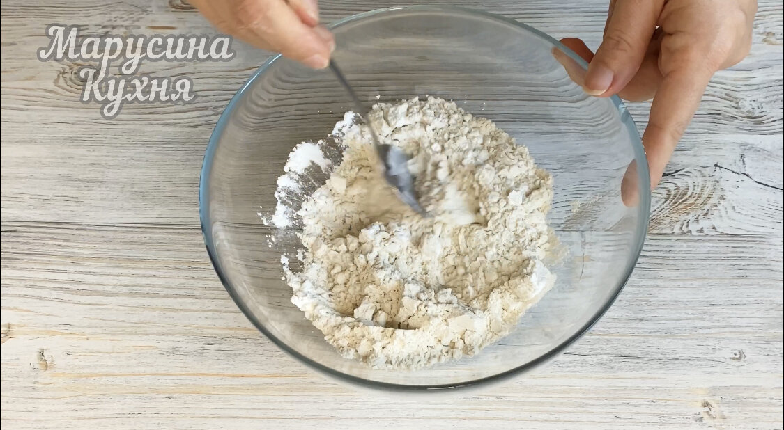 В глубокой ёмкости смешиваю сухие ингредиенты: муку, разрыхлитель, кукурузный крахмал и соль. Муку я использую цельнозерновую для большей пользы.