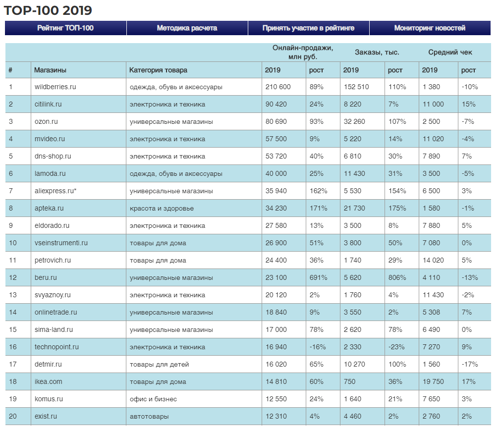 Согласно рейтингу Data Insight, по объему онлайн-продаж Ozon занимает 3 место в России. В 2019 году маркетплейс в 2 раза увеличил оборот продаж и количество заказов.