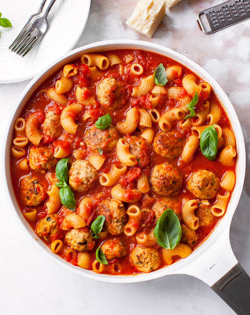 - Добавить все содержимое сковороды с фрикадельками, аккуратно перемешать, накрыть крышкой и варить около 15 минут (по истечении этого времени паста должна стать мягкой). Тем временем осторожно перемешайте дважды.