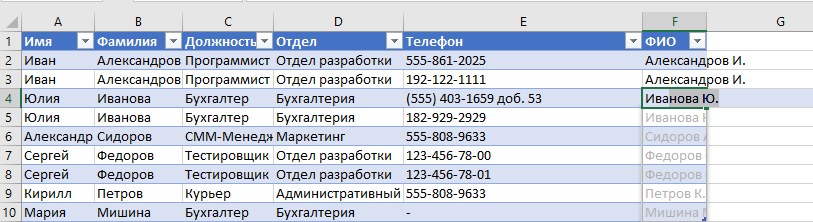 Допустим, у нас есть табличка с именами и фамилиями, а мы хотим переделать в сокращенный вид: фамилия и первая буква имени. Начинаем вбивать данные, и оп-па, на второй или третьей строке Эксель сам предлагает нам ввести оставшиеся данные в соответствии с паттерном, который он увидел!