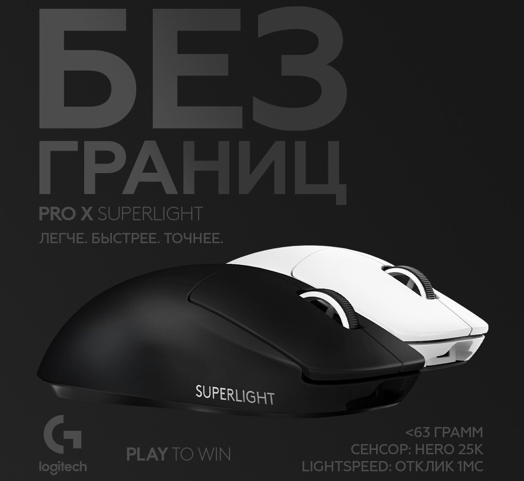 Logitech G Pro X Superlight получила крупные тефлоновые ножки и сенсор Logitech G Hero 25K с чувствительностью 25 600 точек на дюйм. При массе в 63 грамма, мышка работает до 70 часов на одном заряде. Заявлена технология Lightspeed, которая