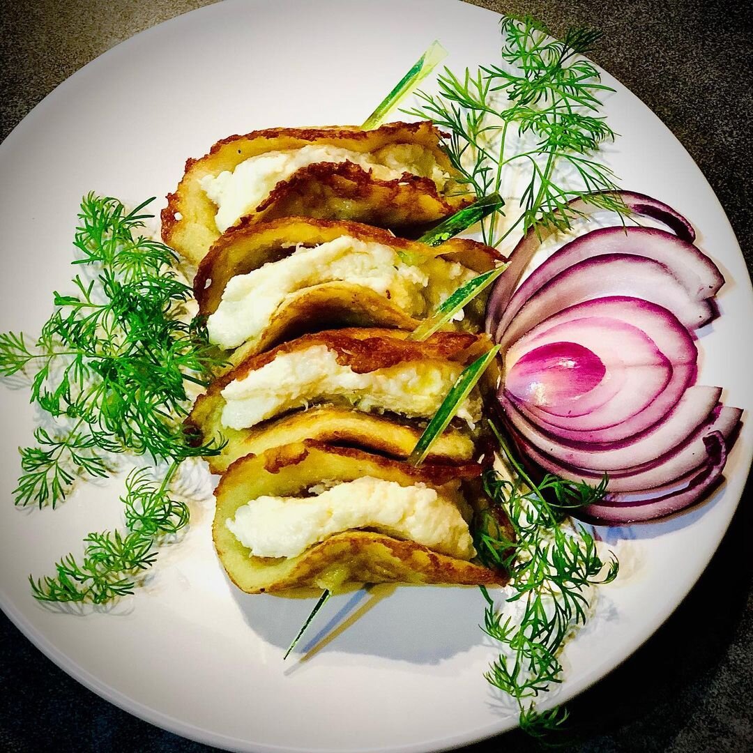 5. Готовые драники немного остудить. Начинить пастой "Крем-Фиш" и сложить "лодочкой". Закрепить края зубочисткой;