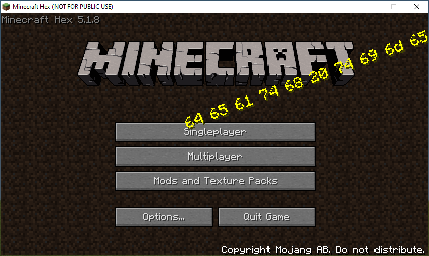 Сначала архив, в нём вы найдёте только один единственный файл, иконка такая же как и оригинальный лаунчер игры, открыв его появляется довольно старый экран загрузки Mojang и через пару секунд мы попадаем в главный меню, кстати надпись сверху гласит что игра не для публичный доступа, что уже начинает потихоньку пугать а жуткий искаженный саундтрек только добавляет мистическая атмосфера, интересный факт, иногда надпись майнкрафт как бы сползает вниз с такой же анимации как и в титрах игры, в глаза бросается мелькающие надписи, например там где пишется версия майнкрафта написано название hex версия, но тут меняются симоволов, работают только три вкладки а именно одиночная игра, сетевая и кнопка покинут игру, зайдя в мультиплеер конечно же не сработает не один из айпи адресов, но можно поговорить мультиплеер.