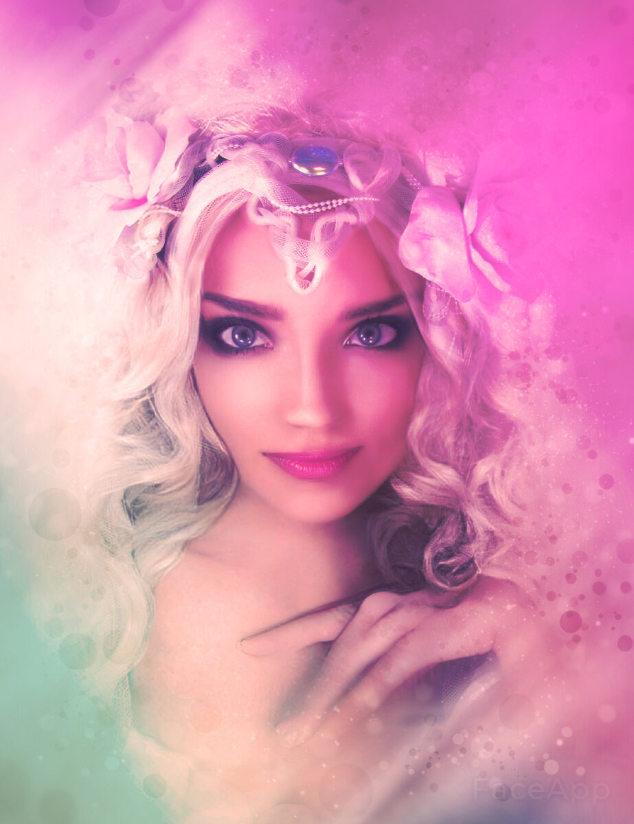 Вообще-то я на ней тренировалась менять цвета - здоровенные цветы на венке на самом деле с желтоватыми лепестками. Картинка уже исправлена специально под последующие фильтры, каковых будет куча. И делала я довольно грубо, потому что те фильтры все равно картинку уменьшат. С лица стерты тени, неровности, в общем, все, что можно. Глаза увеличены, нос замылен, лицо гораздо Уже сделано. На этом этапе еще огромные ресницы пририсовывают :-) Фотографы и ретушеры-профи, если вдруг попадутся такие! Я понимаю, что вы будете ржать :-))