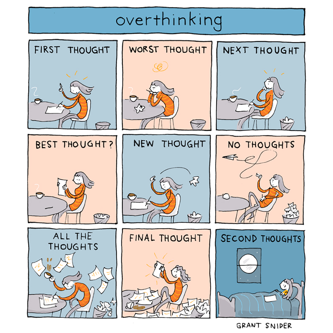 Нашли специально для вас здоровский комикс от американского писателя Гранта Снайдера, который наглядно демонстрирует из каких мыслей состоит overthinking (процесс накручивания себя), вроде first thought (самой первой мысли, пришедшей в голову) и second thought (сомнения, пришедшего и голову после длительных размышлений). Кстати, все конструкции из комикса мы перевели, добавили к ним транскрипции и примеры, чтобы они запомнились вам лучше.