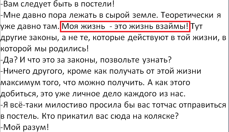 В данной статье я не буду расхваливать эту книгу, так как пишу не о ней. Так же не хочу ничего говорить о её внутренностях: кому интересно - уже прочёл данное произведение или же сделает это в дальнейшем. Но всё-таки один момент расскажу, так как фраза "жизнь взаймы" появляется всего однажды в этом романе. И она по-настоящему важна там.