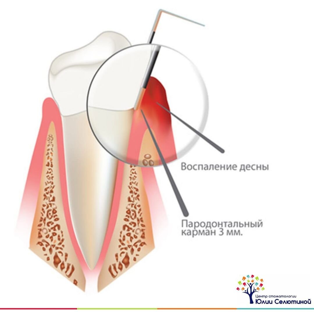 В норме край десны должен отходить от зуба не более чем на 2-3 мм.