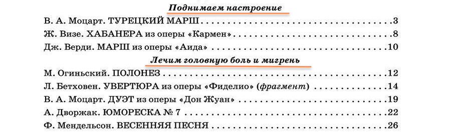 Прогуливаясь по нотному отделу книжного магазина, я увидела один сборник с интересным содержанием. Произведения для фортепиано в нем были расположены по принципу воздействия на организм: