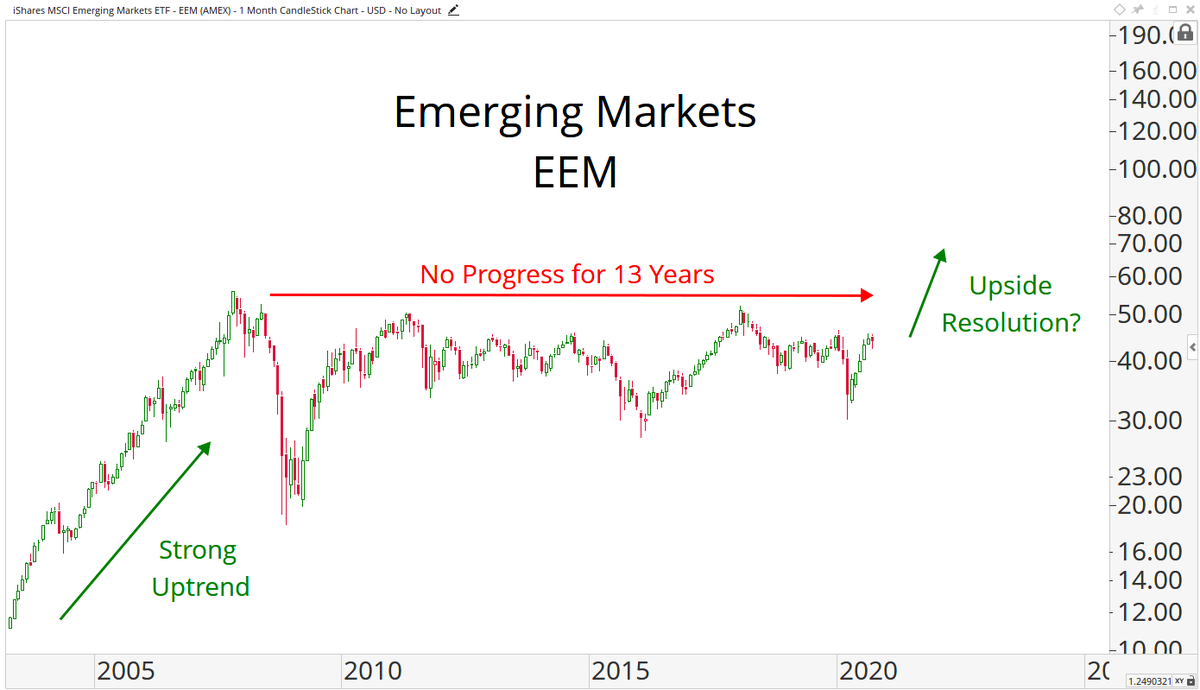 EM болтались 13 лет в ужасном боковике и достигли абсолютно нулевого прогресса с 2007г. Ещё недавно это выглядело вот так, и многие уже тогда задавались вопросом о выходе вверх из затянувшейся коррекции, которая наступила после 4-х лет с ежегодным ростом по 100%. А далее 13 лет переваривания этого роста: