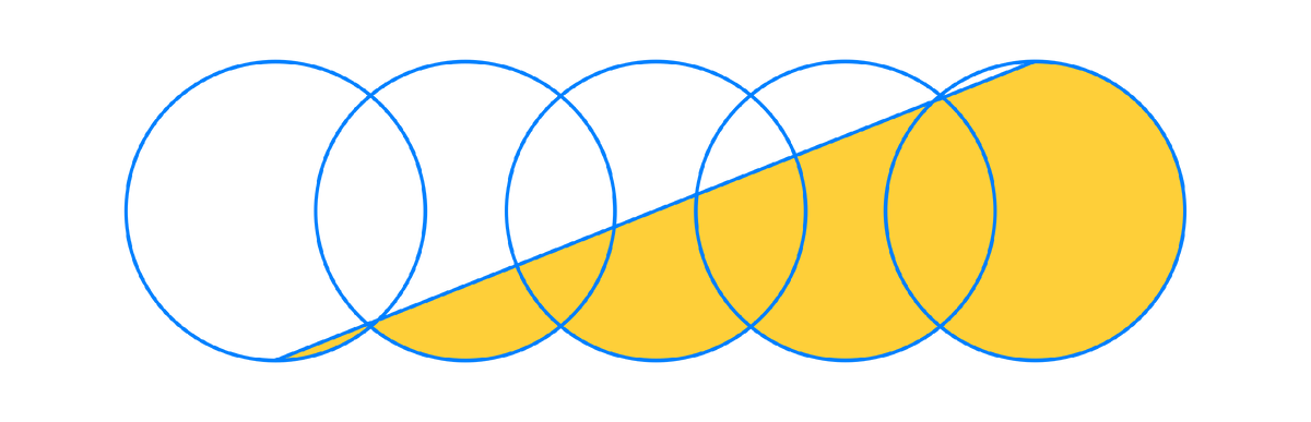 Прямая линия соединяет нижнюю часть первого круга и верхнюю часть пятого круга. Площадь фигуры, выделенная желтым цветом равна 40. Площадь пересечения двух окружностей равна 5.