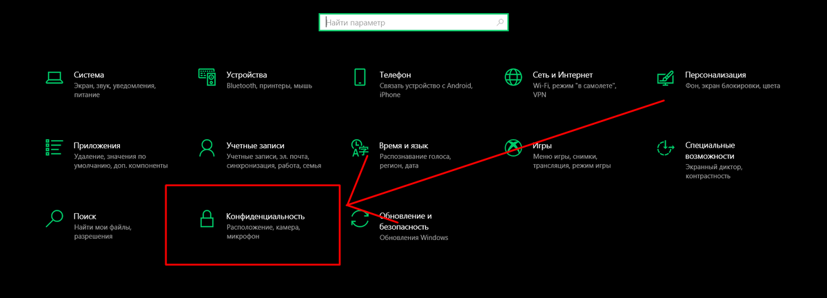 (убираем весь не нужный мусор windows) Нажимаем сочетания клавиш WIN+I У вас откроются параметры Нажимаем на вкладку (Конфиденциальность)