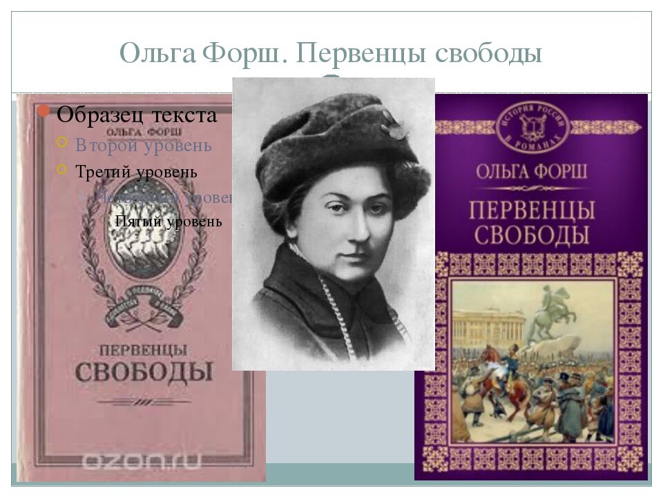 Русская советская писательница Ольга Форш (урожденная Комарова) была очень известна в Советском Союзе и незаслуженно забыта в постперестроечный период. Писала, в основном,исторические романы, рисующие революционно-демократическую борьбу в России на примерах выдающихся личностей. Сам я ее книги не читал, но, по отзывам знакомых – книги достойные.