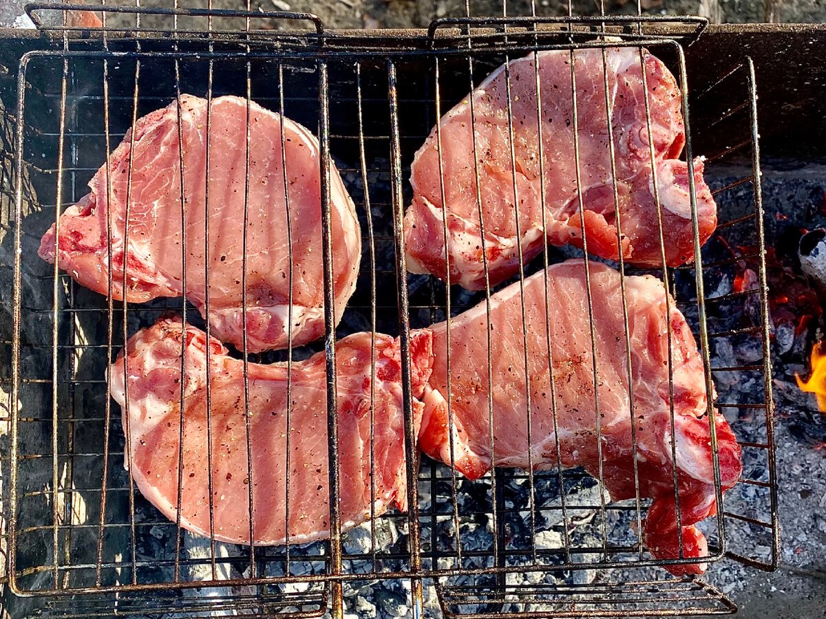 Прям перед самой жаркой посыпаем солью, перцем и поливаем маслом. Ждём эбаут 5 минут. Даём мясу «пожениться» с солью и перцем, и кладём на решётку.