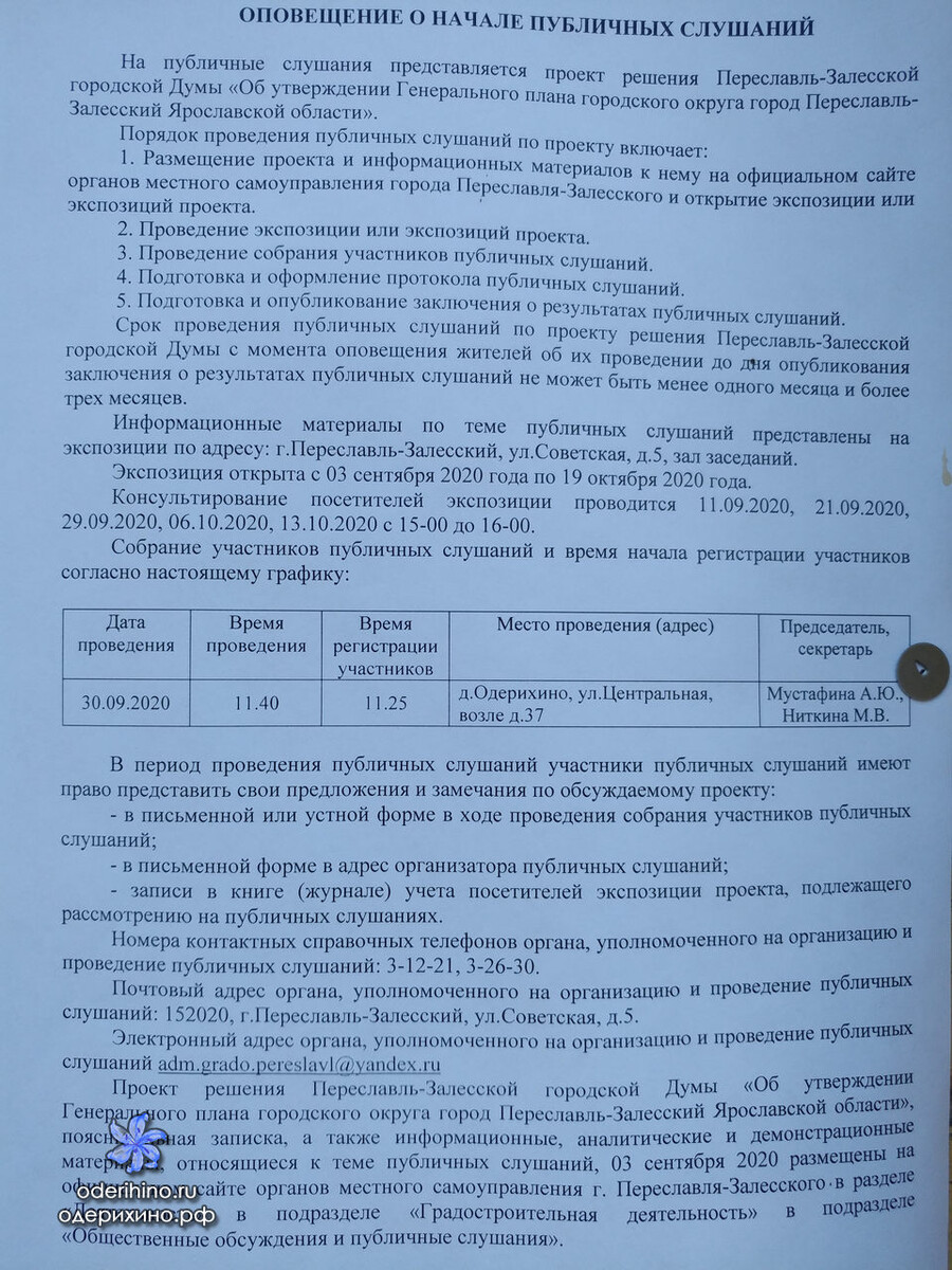 Публичные слушания по проекту решения Переславль-Залесской городской Думы «Об утверждении Генерального плана городского округа город Переславль-Залесский Ярославской области» 30 сентября пройдут в д.Одерихино, в 11:40, время регистрации 11:25