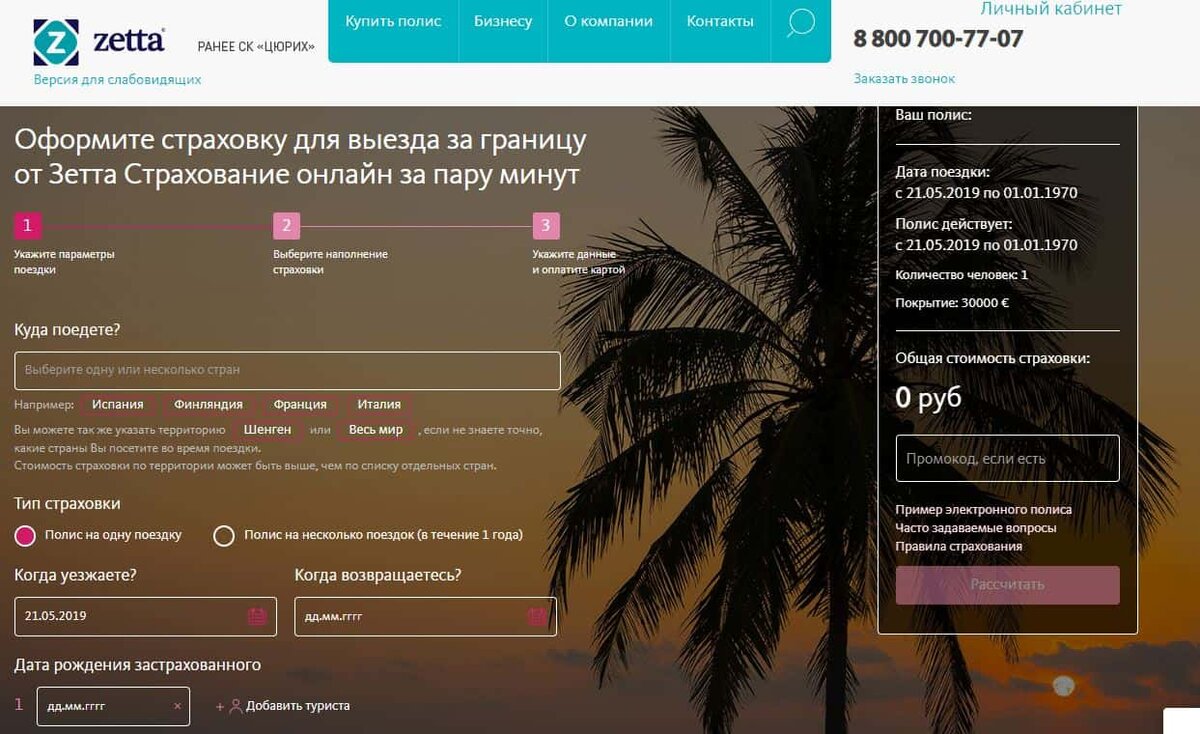 Цена полиса зависит от зоны покрытия, длительности путешествия, возраста владельца страховки, списка включенных дополнительных рисков и суммы покрытия.
