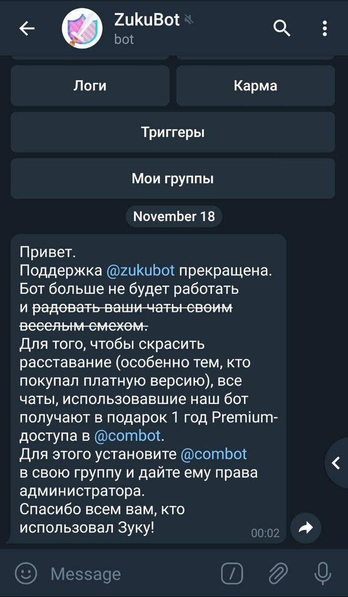 Администраторы, которые использовали Зуку в своих чатах, получили рассылку, где говорится о прекращении поддержки пользователей. Заплатившим за Zuku предлагается получить 1 год премиум подписки в Combot. Вопрос о дальнейшей работе Zuku будет решён позже. Сейчас Combot насчитывает 120 000 активных групп, у Zuku их только 5 000.