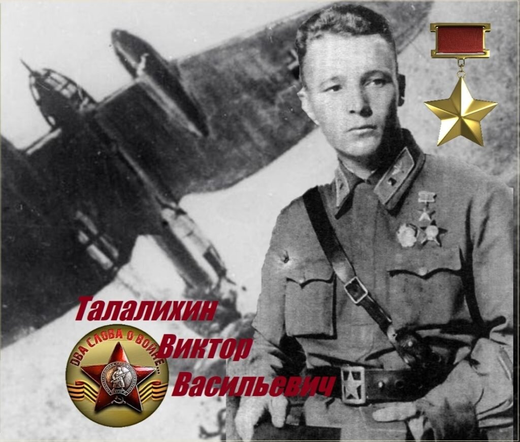 военный летчик, участник Битвы за Москву. 7 августа 1941 г. одним из первых военных летчиков Великой Отечественной произвёл таран в ночном воздушном бою. Раненый летчик спустился на парашюте и вскоре продолжил боевые вылеты. За свой ночной таран был награжден званием Героя Советского Союза. За осень 1941 года сбил еще 5 немецких самолетов. Погиб в воздушном бою около Подольска 27 октября 1941 года. По некоторым данным, самолет Талалихина был найден поисковиками летом 2014 года. Талалихин Виктор Васильевич - заместитель командира эскадрильи 177-го истребительного авиационного полка 6-го истребительного авиационного корпуса войск ПВО территории страны, младший лейтенант. Родился 18 сентября 1918 года в селе Тепловка ныне Вольского района Саратовской области. Русский. Учился в средней школе № 1 города Вольска. В 1934 году с семьёй переехал в Москву, окончил фабрично-заводское училище при Московском мясокомбинате имени А.И. Микояна. В 1934-1937 годах работал на этом мясокомбинате шпигорезом, одновременно учился в Московском аэроклубе. В Красной Армии с декабря 1937 года. Окончил Борисоглебокое военное авиационное училище лётчиков. Принимал участие в советско-финской войне 1939 1940 годов. Совершил 47 боевых вылетов, сбил лично и в группе 4 финских самолёта, за что награждён орденом Красной Звезды. В боях Великой Отечественной войны с июня 1941 года. Произвёл более 60-и боевых вылетов. Летом и осенью 1941 года, сражался под Москвой. В воздушном бою в ночь на 7 августа 1941 года при отражении очередного налёта немецкой авиации на Москву сбил таранным ударом немецкий бомбардировщик, сам был ранен в руку, но благополучно покинул с парашютом повреждённый истребитель. За мужество и героизм на фронте борьбы с немецко-фашистскими захватчиками, указом Президиума Верховного Совета СССР от 8 августа 1941 года младшему лейтенанту Талалихину Виктору Васильевичу присвоено звание Героя Советского Союза с вручением ордена Ленина и медали "Золотая Звезда". Подвиг Героя широко освещался советской пропагандой и часто ошибочно указывалось, что он первым в истории совершил ночной таран. Но в действительности, ранее такой же подвиг совершали и другие советские лётчики. Самым первым из известных его совершивших (в ночь на 29 июля 1941 года) является заместитель командира эскадрильи 27-го истребительного авиационного полка старший лейтенант П.В. Еремеев, также в одном корпусе с Талалихиным защищавший небо Москвы. Вот что рассказывал сам Виктор Талалихин об обстоятельствах боя и мотивах, побудивших пойти на беспримерный подвиг: ”В ночь на 7 августа, когда фашистские бомбардировщики пытались прорваться к Москве, я по приказу командования поднялся в воздух на своем истребителе. Зайдя со стороны луны, я стал выискивать самолеты противника и на высоте 4800 метров увидел "хейкель-1П". Он летел надо мною и направлялся к Москве. Я зашел ему в хвост и атаковал. Мне удалось подбить правый мотор бомбардировщика. Враг резко развернулся, изменил курс и со снижением полетел обратно... Вместе с противником я снизился до высоты примерно 2500 метров. И тут у меня кончились боеприпасы... Оставалось одно - таранить. "Если я погибну, так один, - подумал я, - а фашистов в бомбардировщике четверо". Решив винтом обрубить противнику хвост, я стал вплотную подбираться к нему. Вот нас разделяют каких-нибудь девять-десять мет