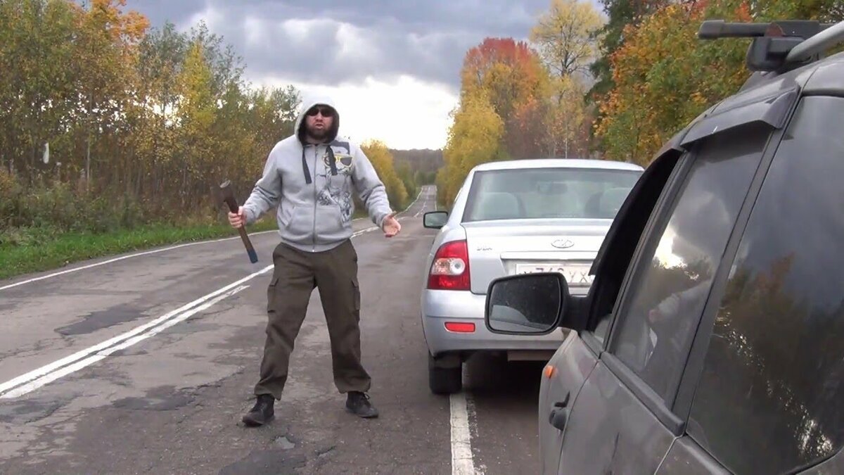 Выходить из машины или нет? Я бы советовал избегать конфликт и остаться в машине. Блокируем двери, закрываем стекло. Далее если он более крупнее вас или вышел не один, то просто включаем заднюю, выезжаете и просто уезжаете! В худшем случае он просто ударяет в бок машины и все!