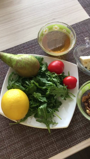 6. Выкладываем в креманку сначала руккола, далее грушу, помидорки, сыр, орешки, поливаем сверху мёдом, сбрызгиваем соком лимона.