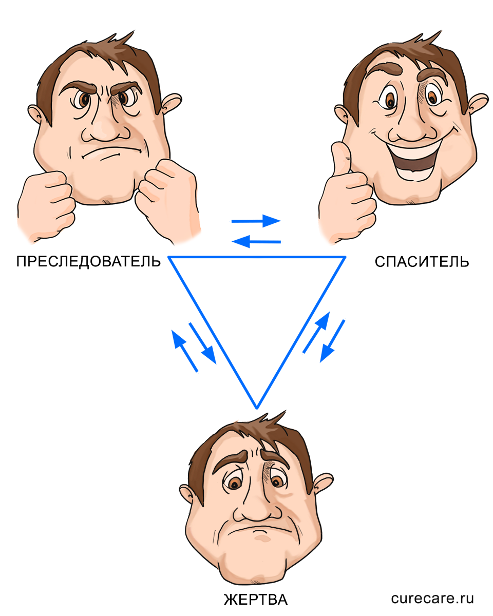 Когда я готовил материал по теме "Манипуляции", то понял, что схема следующая: человек может манипулировать другим человеком в формате 3 ролей - как жертва, как спасатель и как преследователь. В основном, в зависимости от ситуации, человек играет определенную роль. Намного реже он в одной роли всю жизнь.