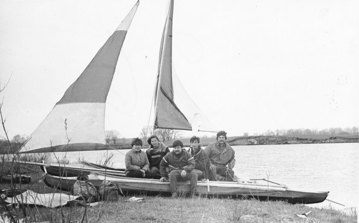 Только когда мы начали вместе ходить в популярные тогда короткие водные походы, я услышал его стихи и песни под гитару. На фотографии Сережа в центре на борту нашего байдарочного парусного катамарана в путешествии по реке Клязьме. Вот там, на природе он смотрел на мир проникающим взором, сочинял и иногда делился созданным.