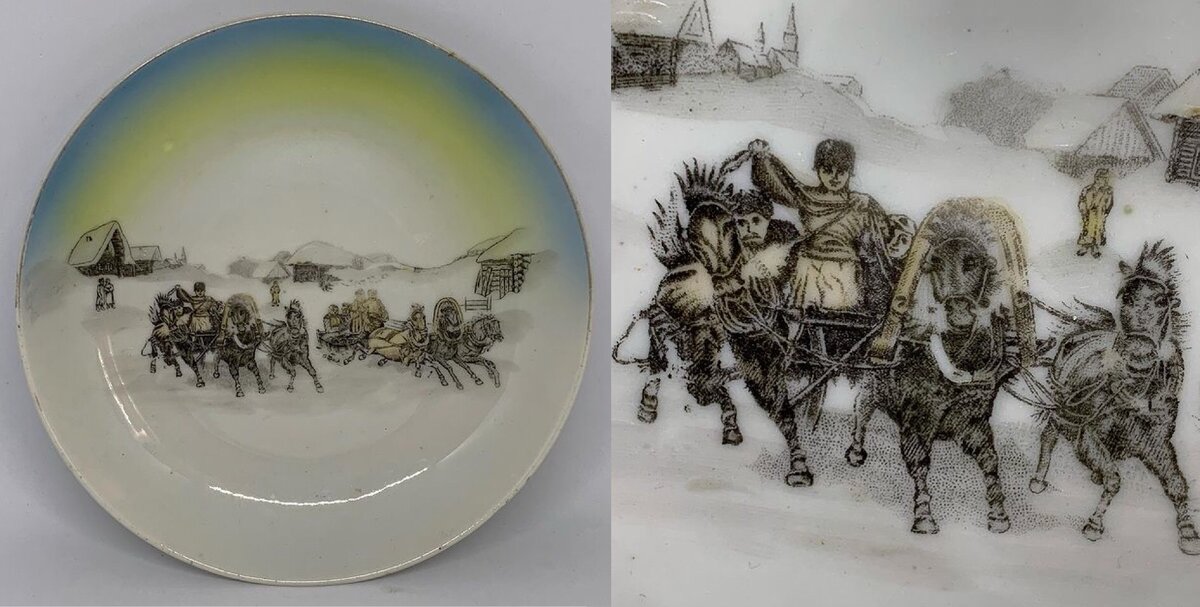 1. Перед вами небольшая декоративная тарелочка с несущимися по заснеженной деревне тройками. Изображение-деколь с подрисовкой.