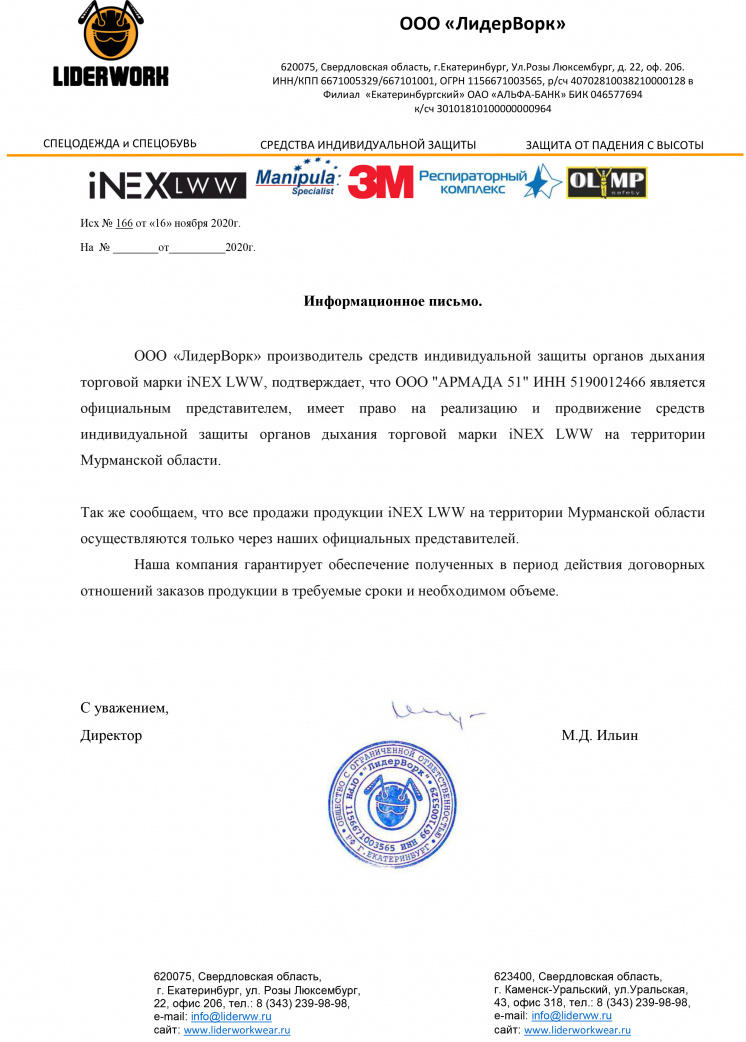 Дорогие клиенты, с радостью сообщаем, что ООО "Армада 51" теперь является официальным представителем компании «ЛидерВорк» — производителя и поставщика спецодежды, спецобуви и средств индивидуальной защиты (СИЗ).