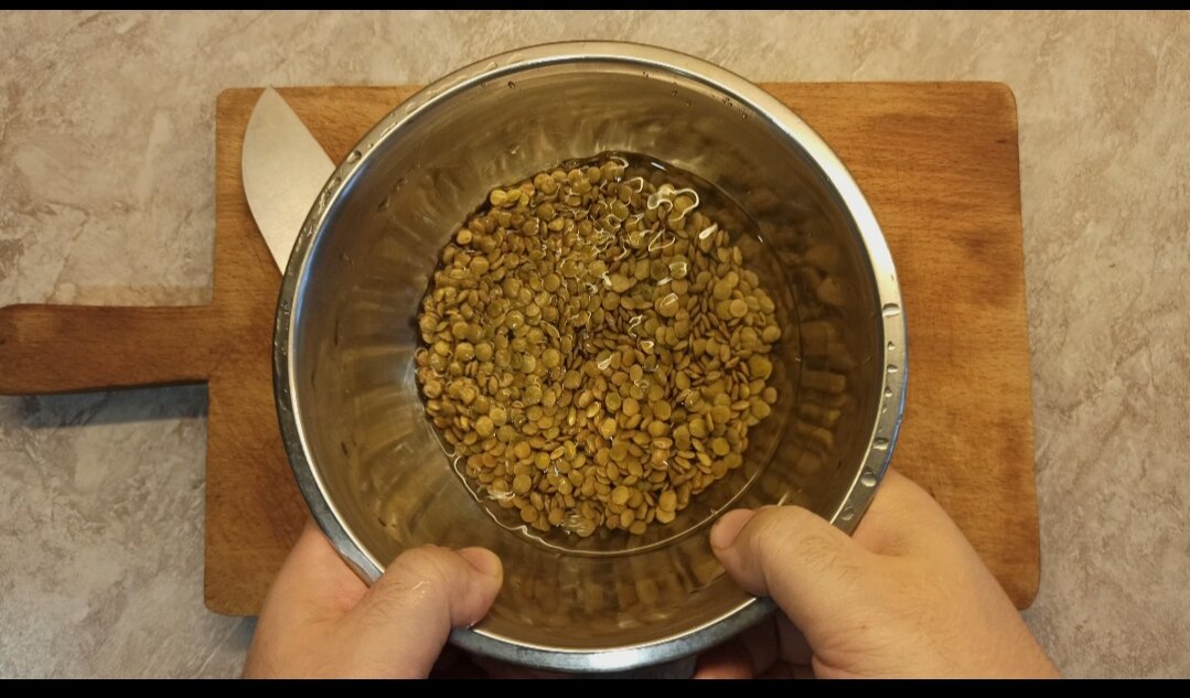 Для начала нужно промыть чечевицу и оставить её воде, пока подготавливаем другие ингредиенты.