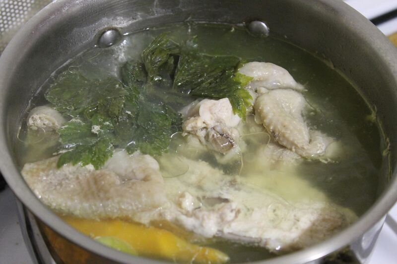 Минут за двадцать до готовности бульона добавляем пряную зелень, лаврушку, перец черный горошком, можно добавить куриную грудку, чтобы получить порционное мясо в тарелке.