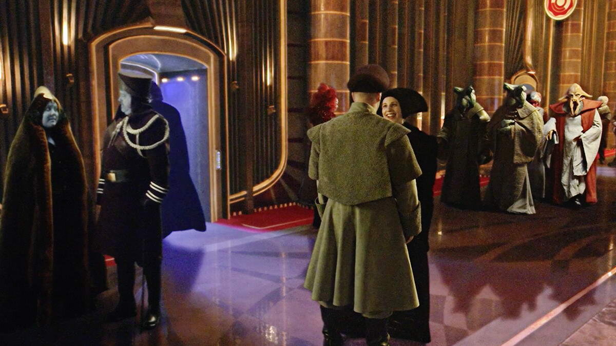 Это мгновение-и-вы-пропустите-его в оперном театре, когда камера панорамирует, чтобы следить за движением Энакина Скайуокера. Посиневший и одетый в авангардную одежду Лукас играет второстепенного персонажа, известного как Барон Папаноида (С левого края). В качестве бонуса его реальная дочь Кэти стоит рядом с ним, как дочь барона.