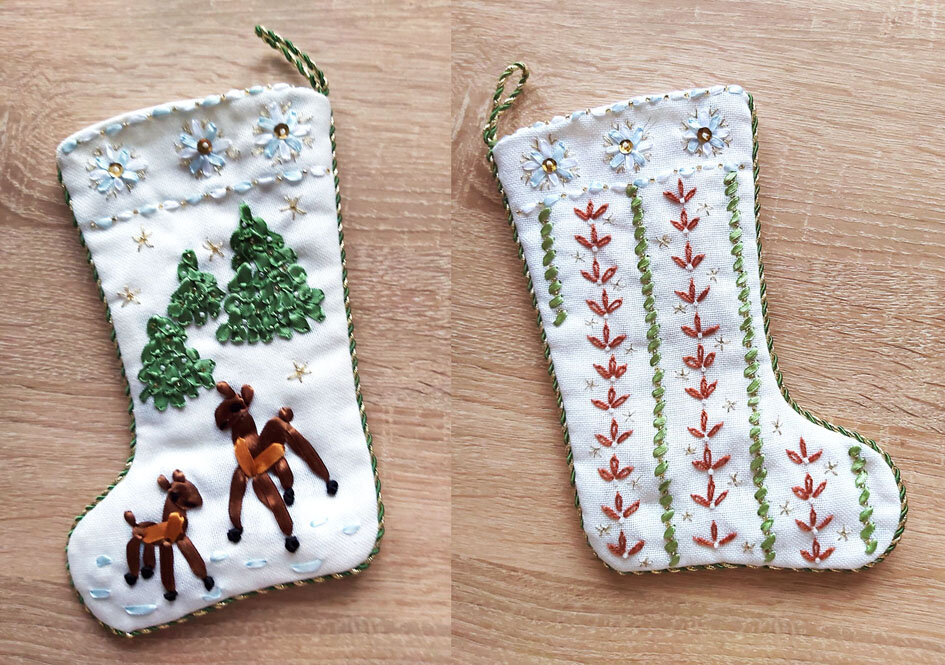 - Продолжаем тему новогодних сапожков, сегодня сапожок с вышивкой лентами. У нас все чаще их используют не только по прямому назначению, но и просто в качестве декора. Прямое назначение такого сапожка (чулка) - в него кладут новогодний подарок от деда Мороза.