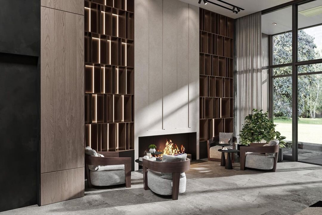 Подчеркнуть эргономику общественного пространства нам помогут тщательно подобранные материалы, которые одновременно создадут атмосферу сдержанной роскоши и будут органично сочетаться с геометрией фасадных решений — это текстуры дерева, латуни, камня и стекла. Каждый элемент будет расположен на своём месте и проработан с мельчайшим вниманием к деталям. А для создания особой атмосферы уюта наше лобби будет оборудовано полноценным камином! Это «Правда».🔥