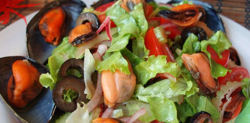 Очищаем лук от шелухи и нарезаем его. Моем помидоры, сельдерей и зелень. В миску выкладываем лук, поверх поливаем лимонным соком и кладем сельдерей. Нарезаем колечками маслины, а помидоры напополам. Кладем в миску. Нарезаем салат, кладем его к остальным ингредиентам. Туда же добавляем мидии. Заправляем оливковым маслом и соком лимона. Солим и аккуратно перемешиваем. Блюдо готово. Приятного аппетита!