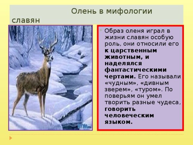 И русский народ не служит исключением из правила. Следы этого культа находят у праславян. В более поздние времена златорогого оленя связали с образом святого Петра. Олень был средством передвижения Петра и его олицетворением.