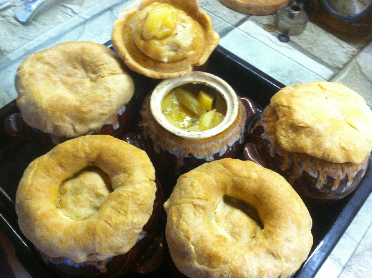 - если речь идет о приготовлении в печи, то для начала я в них наливаю горячую воду, даю им немного прогреться, потом, слив воду, быстро закладываю все продукты, закрываю горшочки крышкой, иногда заматываю их в фольгу. Таким образом они защищены и от высокой температуры, и не пачкаются. Ставлю горшочки в печь, когда она уже протоплена и закрыта, и ухожу заниматься своими делами. В этом случае блюда готовятся дольше, чем в духовке. Они томятся, и через несколько часов этакого томления в горшочках получается нечто очень вкусное.