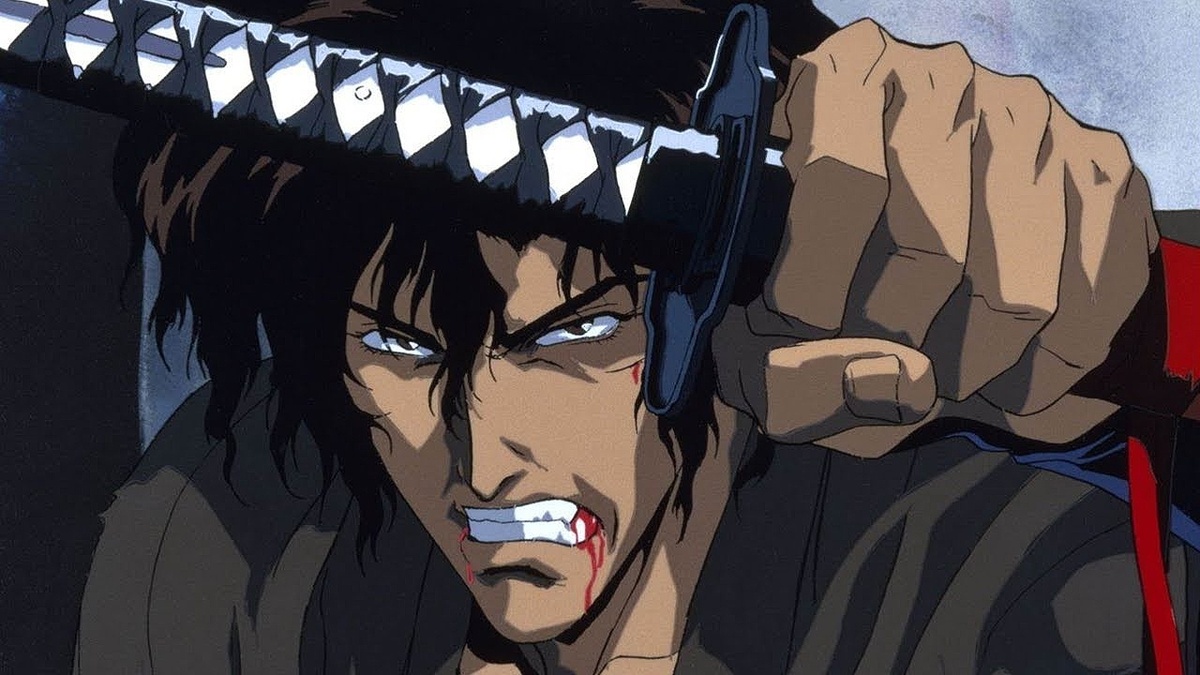 А изображен там персонаж из аниме Ниндзя Скролл. История Скролла начниается в далеком прошлом когда зло окружило всю Японию. А Скролл был обычным наемником который пытался прокормить своего сына. И демон когда возвращается с очередного задания и замечает что его сына демон сожирает и он в ярости чуть